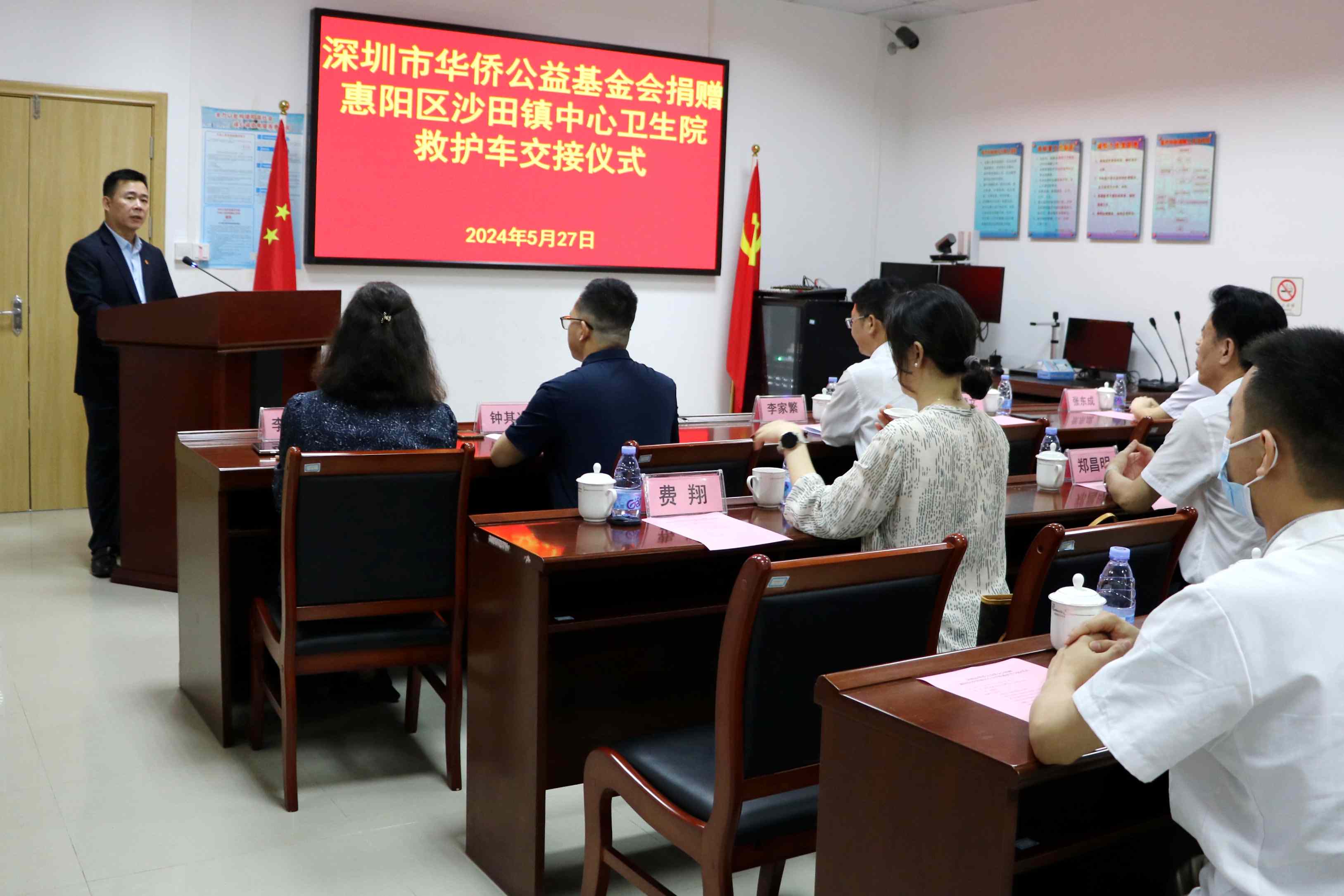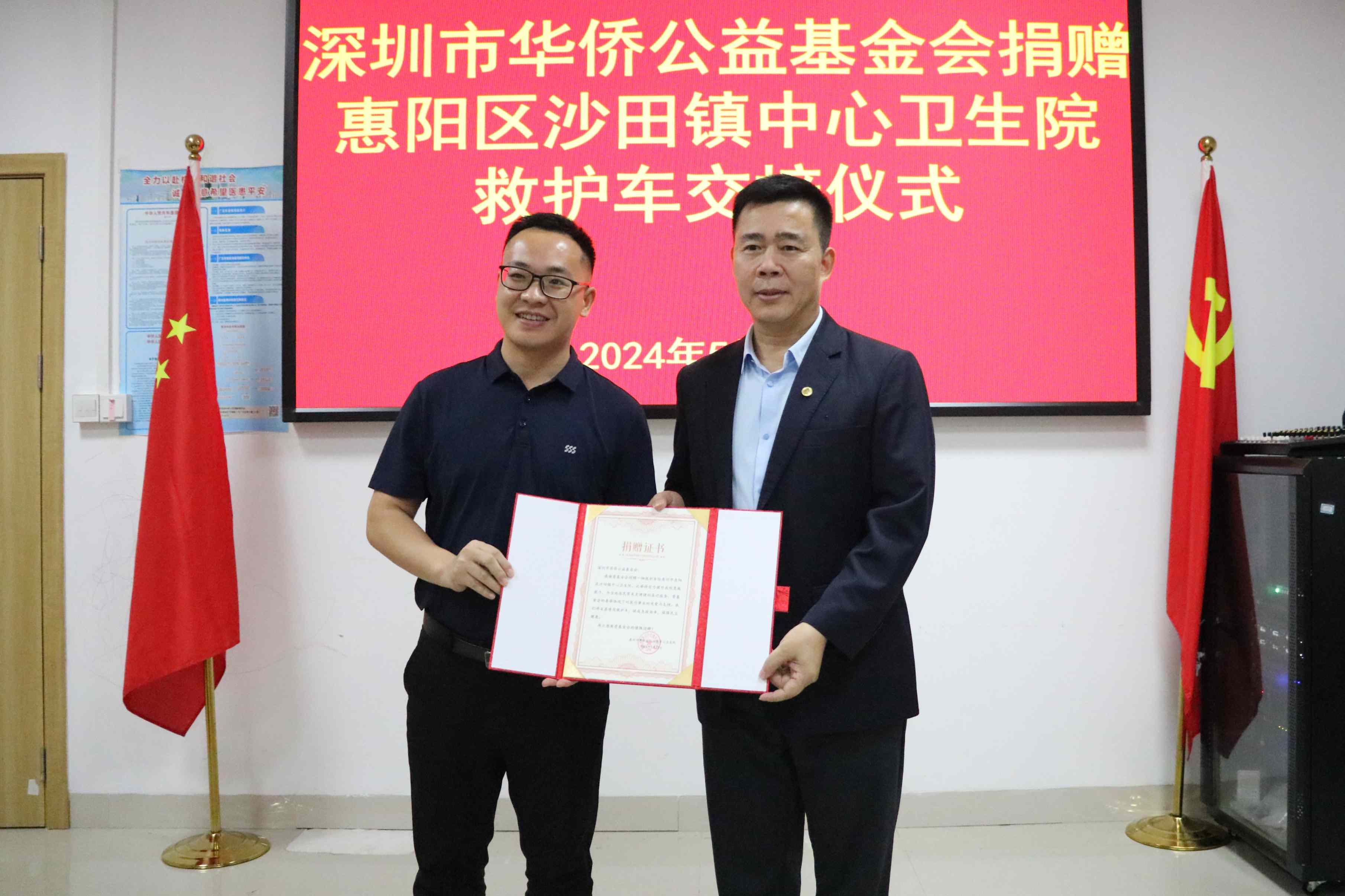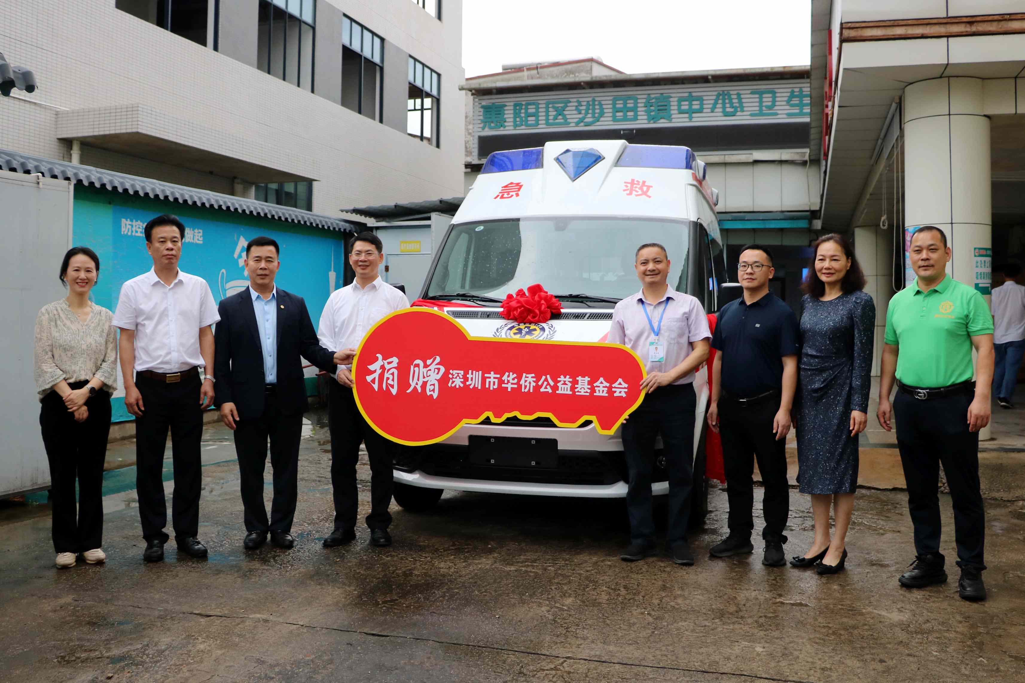 5月27日下午,银广厦集团有限公司通过深圳市华侨公益基金会银广厦专项基金向惠州沙田镇中心卫生院捐赠了一辆崭新的高配置救护车,助力提升该医院急诊急救工作条件,更好地保障人民群众的身体健康和生命安全。深圳市委统战部侨工部处长李家繁、银广厦集团有限公司董事长陈镇文、深圳市华侨公益基金会秘书长万庆、惠州市桓公慈善会会长郑昌明、惠阳区沙田镇镇长钟其准、沙田镇商会会长李秋明、沙田镇中心卫生院院长张东成等领导参加了捐赠仪式。
