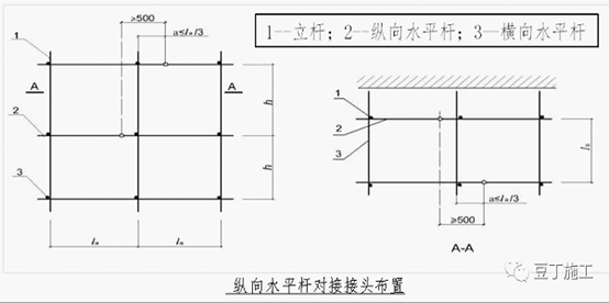 ①两根相邻纵向水平杆的接头不应设置在同步或同跨内;不同步或不同跨两个相邻接头在水平方向错开的距离不应小于500mm;各接头中心至最近主节点的距离不应大于纵距的1/3。