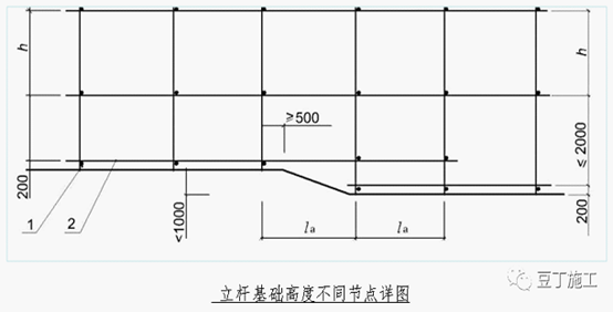 ②脚手架立杆基础不在同一高度上时,必须将高处的纵向扫地杆向低处延长两跨与立杆固定,高低差不应大于1m。靠边坡上方的立杆轴线到边坡的距离不应小于500mm。