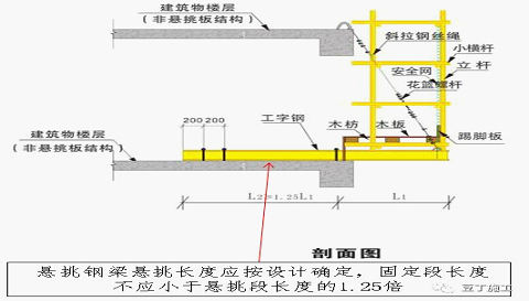 6.悬挑钢梁支撑点应设置在结构梁上,不得设置在外伸阳台或悬挑板上,否则应采取加固措施。