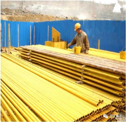(2)全数目测检查钢管表观质量缺陷,表面应平直光滑、不应有裂缝、结疤、分层、错位、硬弯、毛刺、压痕、严重腐蚀等缺陷,严禁钢管打孔;钢管使用前必须刷防锈漆。