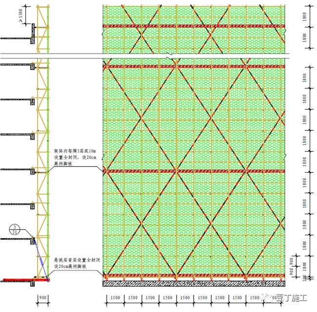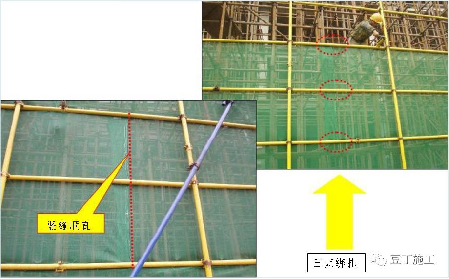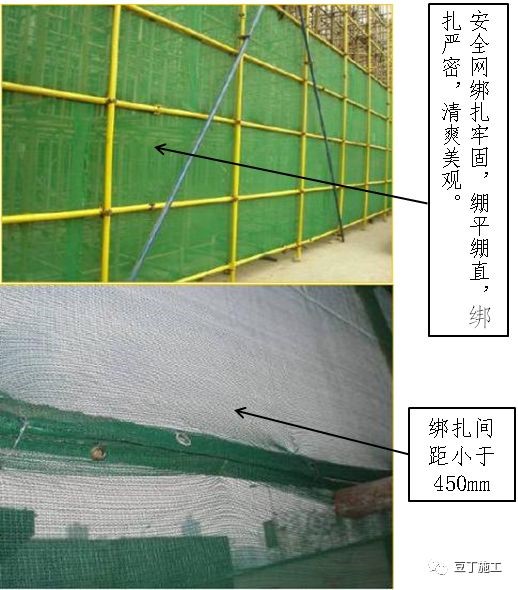 质量控制要点:密目式安全网搭时,每个开眼环口应穿入系绳,系绳应绑扎在支撑架上,间距不得大于450mm。