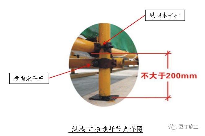 ①脚手架必须设置纵、横向扫地杆。纵向扫地杆应采用直角扣件固定在距钢管底端不大于200mm处的立杆上。横向扫地杆应采用直角扣件固定在紧靠纵向扫地杆下方的立杆上。