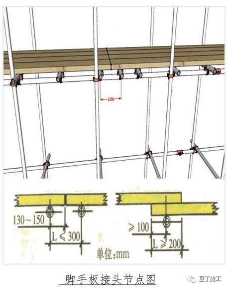 (3)脚手板的铺设应采用对接平铺或搭接铺设;脚手板对接平铺时,接头处应设两根横向水平杆,脚手板外伸长度应取130mm -150mm,两块脚手板外伸长度的和不应大于300mm;脚手板搭接铺设时,接头应支在横向水平杆上,搭接长度不应小于200mm,其伸出横向水平杆的长度不应小于100mm。
