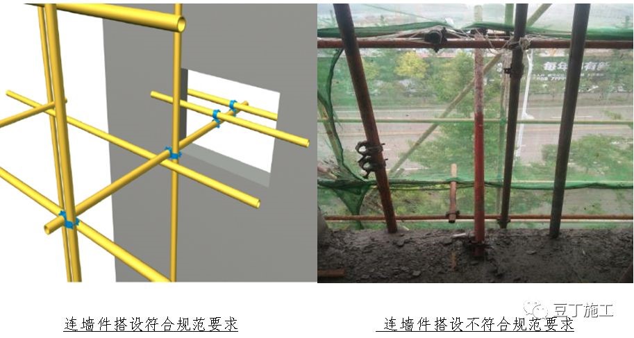 (4)连墙件中的连墙杆应呈水平设置,当不能水平设置时,应向脚手架一端下斜连接。