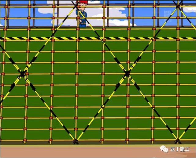 (3)开口型双排脚手架的两端均必须设置横向斜撑,横向斜撑应在同一节间,由底至顶层呈之字形连续布置。