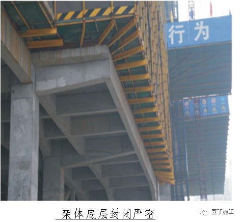 11.架体作业层脚手板下应采用安全平稳兜底,以下每隔10m应采用安全平网封闭。架体底层沿建筑物结构边缘在悬挑钢梁与悬挑钢梁之间应采取措施封闭。架体底层应进行封闭。