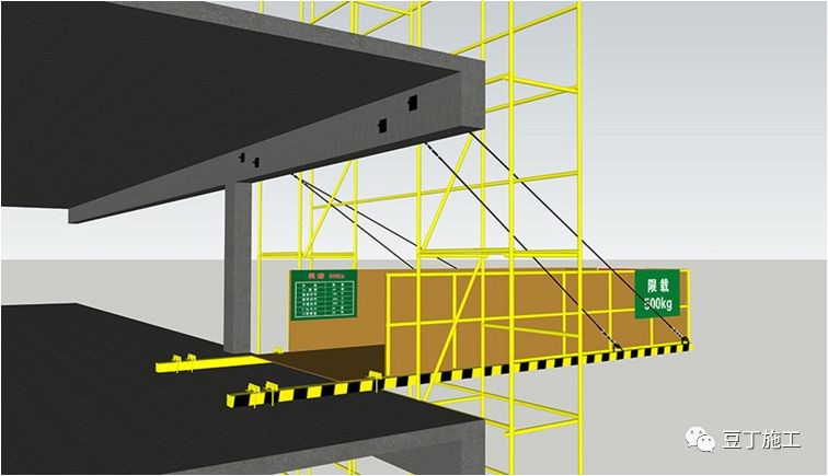 3.斜拉方式的悬挑操作平台,平台两侧的连接吊环应与前后两道斜拉钢丝绳连接,每一道钢丝绳应能承载该侧所有荷载。