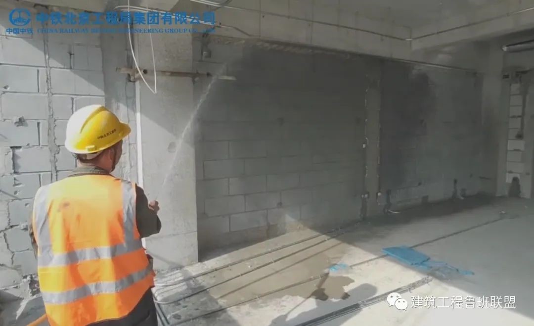 在甩毛前一天,用软管顺墙至上而下浇水湿润,冲去墙面渣沫,保证墙体湿润。