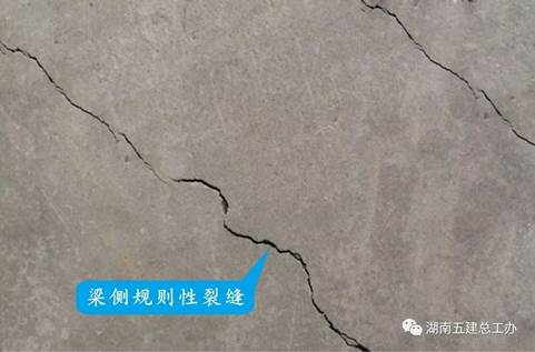 表现形式:现浇楼板上表面在梁两侧出现规则性裂缝。